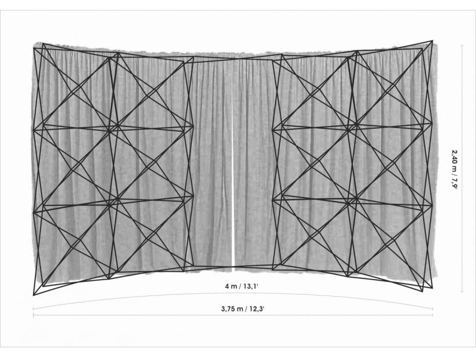 Gesamtgewicht: 17 kg – Grösse: 375 × 240 cm – Aufbauzeit: 3–4 Minuten – Vorhangfarben: Schwarz.