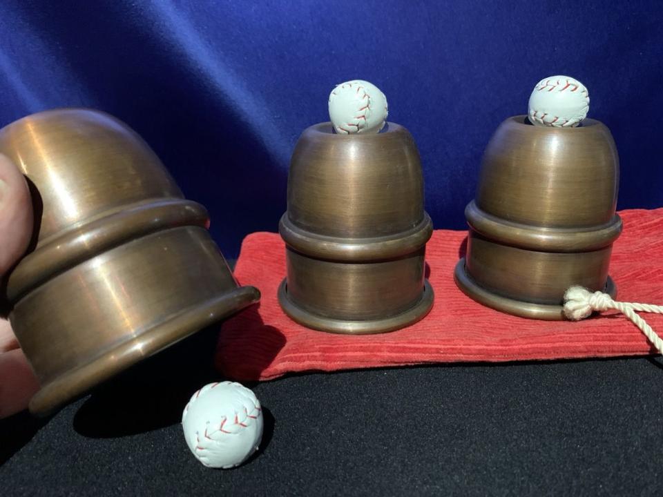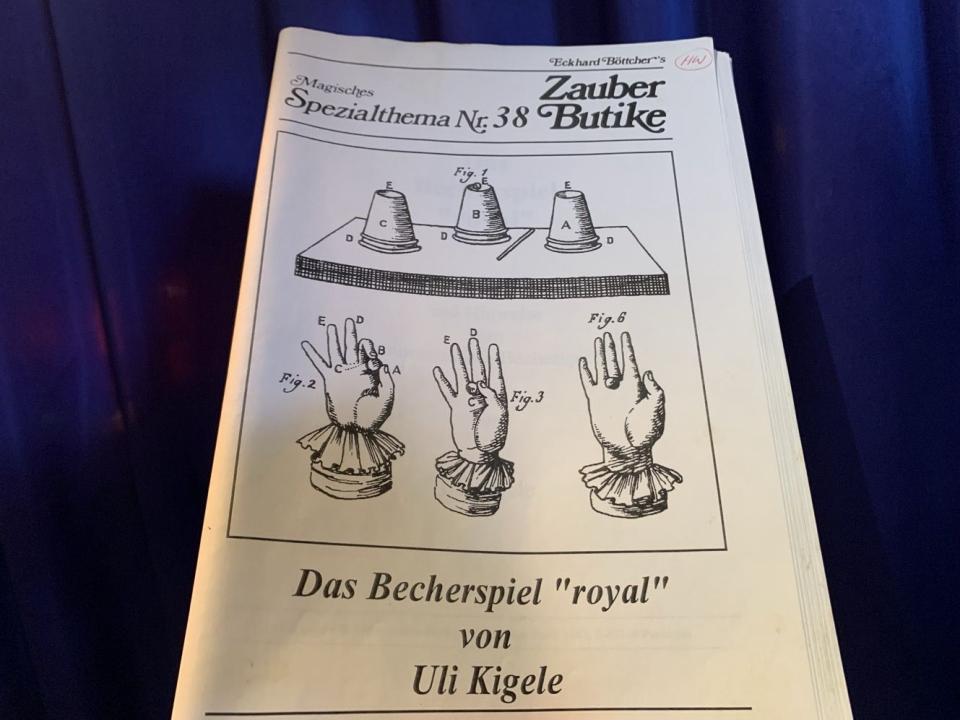 Kurz und gut: Dies ist das beste Becherspiel, das es zurzeit auf dem europäischen Markt gibt. Qualität hat ihren Preis, der sich aber sehr schnell bezahlt macht. Sie bekommen die drei Becher in einem Stoffbeutel sowie vier Miniatur-Baseballs aus echtem, weissem Leder, fein säuberlich mit rotem Faden von Hand zusammengenäht. Durchmesser ca. 2,4 cm, auch für die Bühne gross genug, inklusive gratis dazu eine A4 Broschüre, 31 Seiten in deutscher Sprache: von Eckhard Böttcher’s ZAUBER BUTIKE, Magisches Spezialthema Nr. 38. DAS BECHERSPIEL «ROYAL» VON ULI KIGELE.