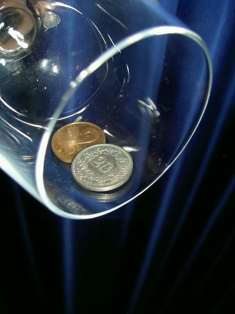 Jeder Zauberer kennt sie: Eine ausgedrehte 20 Rappen Münze, die so perfekt gearbeitet ist, dass sie über eine 2 Rappen Münze passt! Damit sind Effekte möglich, die an Zauberei grenzen: Zwei Münzen (20+2 Rappen) werden in ein schräg gehaltenes, langstieliges Weinglas gegeben. Das Glas wird in die Senkrechte gedreht und ohne dass Sie die Münzen berühren, durchdringt eine Münze den Glasboden, wandert scheinbar durch den Glasstiel und fällt durch den Boden des Glases heraus klimpernd auf den Tisch!!! Hans Meier war Feinmechaniker und hatte diese zwei Schweizer Münzen in den 70er Jahren in seiner Freizeit bei der Firma Oerlikon-Bührle hergestellt. Sollten Sie diesen Artikel bei uns erwerben, so haben Sie nicht nur ein ausgezeichnetes Spitzenprodukt Made in Switzerland, sondern ein Unikat, TOP VERARBEITUNG!