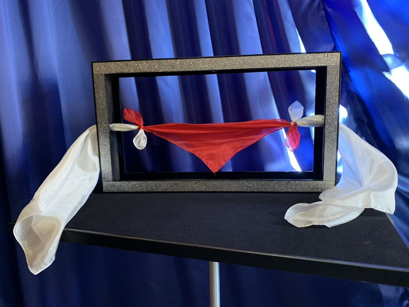 Der Magier zeigt einen mit Silberglimmer belegten Rahmen, in dessen Seitenwänden sich je eine Bohrung befindet. Durch diese Bohrungen steckt der Magier nun zwei gleichfarbige Tücher, deren Zipfel sich für alle deutlich sichtbar ca.4 cm im Rahmen befinden. Dazwischen wird ein aufgeblasener Luftballon in den Rahmen geklemmt. Nun lässt der Magier ein Tuch, dessen Farbe einen hübschen Kontrast zu den beiden anderen Tüchern bildet, verschwinden. Sobald das Tuch verschwunden ist, platzt der Luftballon und das soeben verschwundene Tuch befindet sich eingeknotet zwischen den beiden anderen im Rahmen. Der Blitzeffekt der Extraklasse. Kein Abdecken des Rahmens, keine Trickserei, einfach zauberhaft, zauberhaft einfach! Komplett mit allen erforderlichen Tüchern (Neupreis 225 CHF).