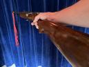 Ein an einer Kugel befestigtes Band wird in ein Gewehr geladen. Wenn auf der anderen Seite der Bühne auf das Ziel, vor dem Ihre Assistentin steht, geschossen wird, durchbohrt das Band den Mittelteil der Assistentin und die Kugel steckt auf der Zielscheibe. Es ist zu sehen, wie das Band durch den Körper der Dame läuft und ohne negative Auswirkungen hin und her gezogen werden kann.