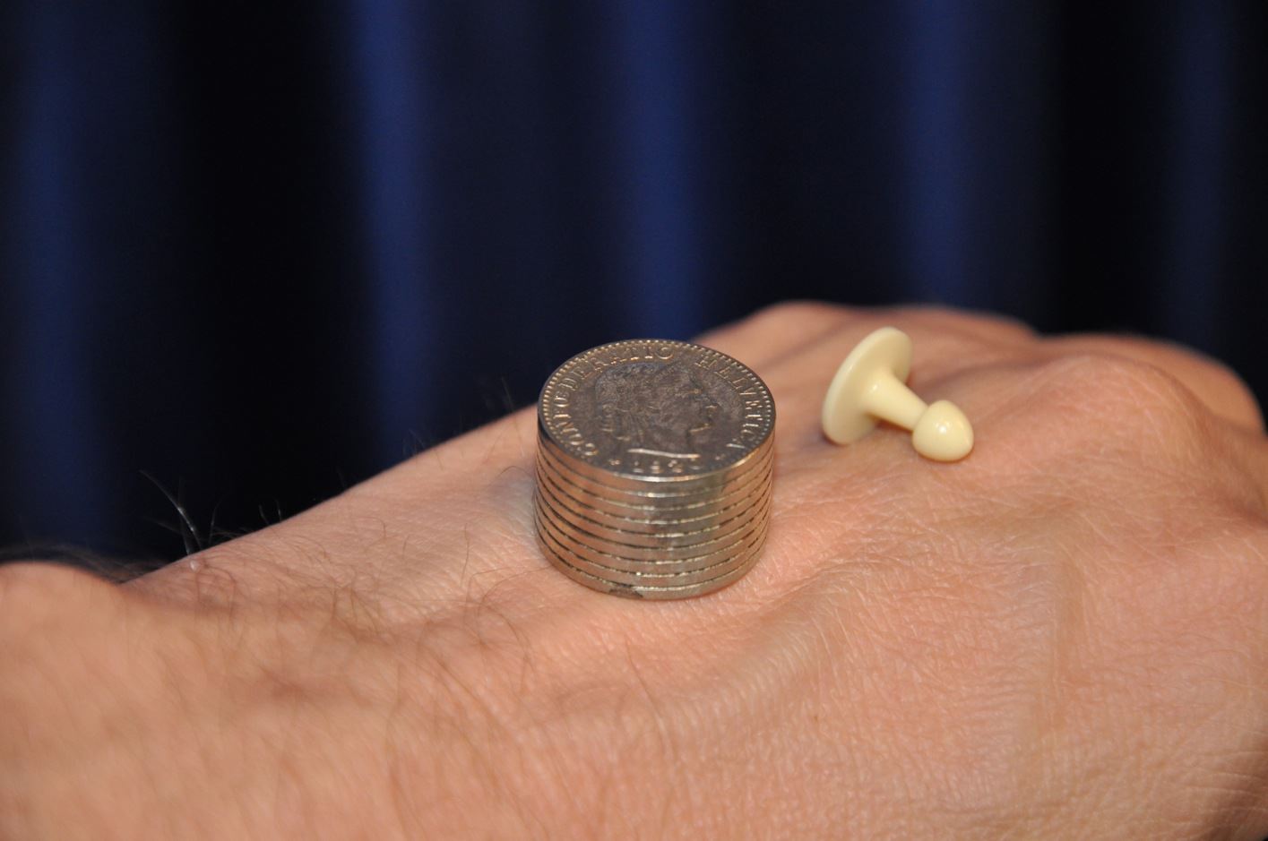 Grösster Effekt bei Tischkunststücken mit Münzen! Holen Sie aus Ihrer Geldbörse 9 Münzen zu 20 Rappen und diesen Stapel setzen Sie einer Dame auf den Handrücken. Das Ganze wird nun bedeckt mit einem Tüchlein, Karte oder einer Papiertüte. Ihre liebenswürdige Assistentin wird Ihnen gerne bestätigen, dass Sie 90 Rappen auf der Hand hat und nichts weiter; denn Sie konnte nichts anderes bemerken. Doch welche Überraschung, wenn Sie nun nach einem kleinen Zauberspruch die Hülle abheben - auf dem Handrücken steht nämlich nur - ein Kragenknöpfchen! Präzision der Spitzenkklasse, Rarität 1 A!