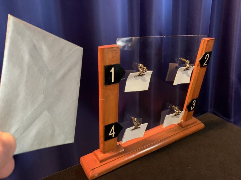 Sie beginnen damit, dass Sie an vier Zuschauer je einen Zettel verteilen. Jeder soll nun einen Begriff aufschreiben: eine Spielkarte, einen Vornamen, eine Zahl und eine Farbe. Die zusammengefalteten Zettel werden für alle sichtbar an den Clips auf der Plexiglasscheibe befestigt. Auf Wunsch können die Zettel zusätzlich in Umschläge gesteckt werden, die die Aufschrift der Zettel kennen.