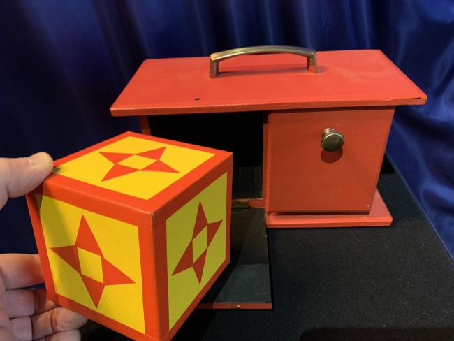 Der beliebte Aufsitzer-Effekt in einer besonders schönen Ausführung! Ein 10 × 10 cm grosser Würfel (gelb mit rotem Stern-Dekor) kommt in einen „Tresor“, einen Kasten mit vier Türen, in dem zwei Würfel nebeneinander Platz hätten.