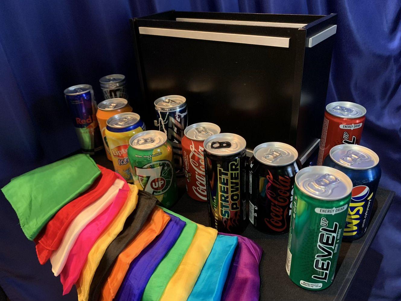 Auf dem Tisch steht ein kleines, schwarzes Kästchen, Grösse 31 x 22 x 10 cm. Die Vorder- und die Rückwand werden nach oben herausgezogen und entfernt. Nun kann man durch das leere Gehäuse schauen, ja, man könnte es sogar untersuchen lassen. Vorder u. Rückwand werden wieder eingesetzt und nun folgt eine nicht enden wollende Produktion von Seidentüchern. Insgesamt holt der Zauberkünstler über 50 Tücher aus dem Kästchen (30 x 30 cm). Natürlich können es auch entsprechend weniger, dafür aber grössere Tücher sein. Aber das ist nicht alles! Nachdem dieser Tücherberg produziert und der Kasten wieder leer gezeigt wurde, holt der Künstler jetzt 12 Getränkedosen aus dem Kasten hervor. Wenn er diese nach der Produktion wieder in den Kasten zurückstellen will, stellt sich heraus, dass nur sechs Dosen hineinpassen. Für die Unmenge an Tüchern und die restlichen sechs Dosen ist kein Platz mehr! Folgendes sollten Sie wissen: Für die Produktion benötigen Sie nur den Kasten. Es sind keine zusätzlichen Hilfsmittel oder Körperladungen erforderlich. Wenn Sie möchten, können Sie bis zu sechs der produzierten Dosen verschenken oder sofort öffnen und ausgiessen (Allerdings verringert sich dann die Anzahl der produzierten Tücher). Sie erhalten die hochwertig produzierten, erforderlichen Requisiten, inklusive 12 verschiedenfarbige Seidentücher à 60 x 60 cm.