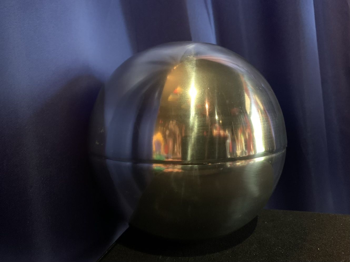 Eine schönere Ausführung dieser schwebenden Kugel haben Sie noch nicht gesehen! Silberglänzende Metallkugel (leichtes Aluminium), Durchmesser ca. 13 cm. Der Effekt ist bekannt: Die Kugel schwebt auf, hinter und unter einem Tuch in vielen Variationen. Zum Schluss kann die Kugel in der Mitte geteilt werden, sodass Sie in jeder Hand eine Schale mit Klappblumen halten. Das Hilfsmittel ist stabil und samtartig überzogen.