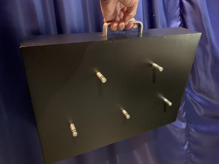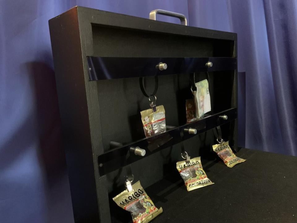 Rundum aus nächster Nähe vorführbar, auch mit mehreren Zuschauern, automatische Funktion. Sie müssen den Koffer nicht einmal selbst halten. Am Schluss kann der Vorhang entfernt werden; alles ist zeig- und untersuchbar. Ideal für Firmenshows aller Art. Andere Trostpreise möglich.