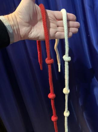 Variante: Zwei Seile (weiss/rot, je ca. 90 cm) werden gezeigt. Die unteren Enden kurz anheben und fallen lassen – in jedem Seil entsteht ein fester Knoten. Wieder anheben/fallen lassen – die Knoten haben die Farbe getauscht. Seile zusammennehmen und einem Zuschauer zur Prüfung übergeben – keine Präparation, knotenlos.