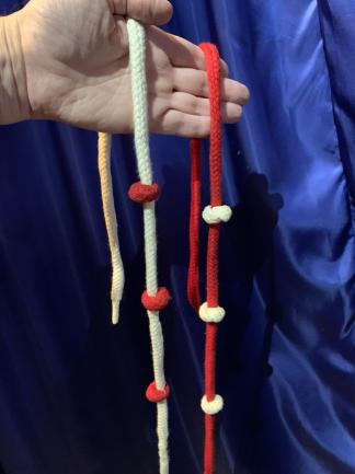 Der Vorführende zeigt ein rotes und ein weisses Seil. Nacheinander wickelt er die Seile um die linke Hand – plötzlich erscheinen in beiden Seilen drei Knoten. Das rote Seil wird zusammengerollt und in einen Becher oder in die Hosentasche gesteckt (ein Stück bleibt sichtbar); ebenso das weisse. Zieht man die Seile wieder hervor, befinden sich auf dem weissen Seil die roten und auf dem roten Seil die weissen Knoten. Seile um die Hand, etwas Zaubersalz … alle Knoten sind verschwunden.