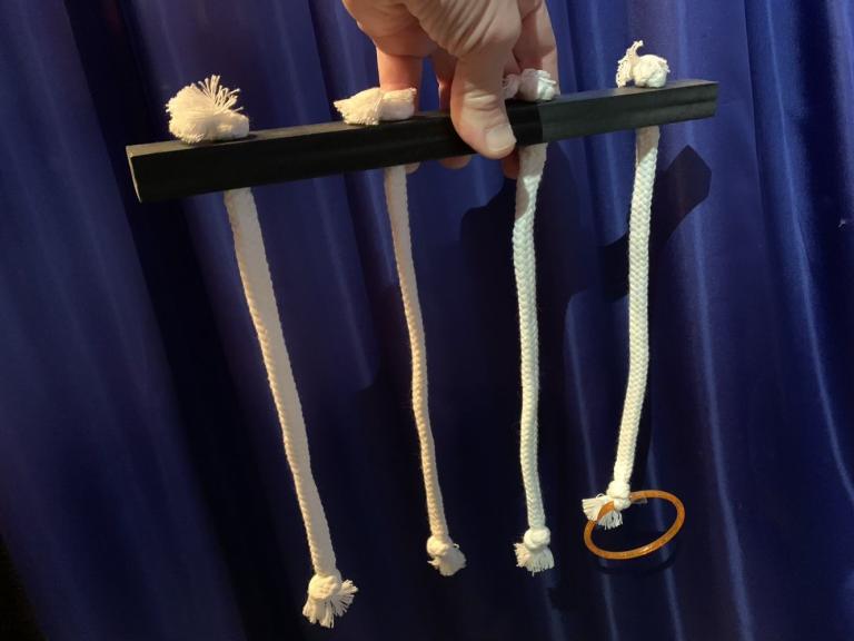 Ein Ring, der an einem von vier Seilen befestigt ist, springt von diesem Seil zu den anderen! Ein Selbstgänger, sehr empfehlenswert.