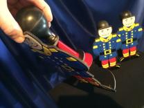 Sie stellen auf einem Tisch drei Feuerwehrmänner auf. Der Oberfeuerwehrmann will in den Ruhestand treten; deshalb soll aus den Dreien ein würdiger Nachfolger gefunden werden. Da ein Oberfeuerwehrmann besonders gut die Hupe betätigen muss, werden die Drei gebeten, ihre Hupen mitzubringen. Zunächst wendet man sich dem Linken zu. Leider funktioniert seine Hupe nicht. Auch die Hupe vom Rechten gibt keinen Laut von sich. Einzig die Hupe vom Mittleren kann ein Geräusch erzeugen. Nun werden die Feuerwehrmänner immer wieder umgestellt, und die Kinder schaffen es einfach nicht, denjenigen zu erraten, dessen Hupe funktioniert. Eine Weile machen sie mit, aber dann bemerken sie, dass Sie eine vierte Hupe hinter dem Rücken verbergen. Sofort ist ihnen klar, dass das Geräusch mit dieser vierten Hupe erzeugt wurde. Kleinlaut geben Sie ihnen recht. Jetzt darf ein Kind zum Assistieren auf die Bühne kommen. Es erhält die vierte Hupe und soll sie auf ein Zeichen von Ihnen hin betätigen. Es stellt sich jedoch heraus, dass diese Hupe gar nicht funktioniert. Das Kind probiert nun alle vier Hupen aus, doch keine gibt einen Laut von sich. Wie kann das sein? Sie probieren nun selbst die Hupen aus, und jedesmal ertönt ein lautes Signal! Sie müssen zu keinem Zeitpunkt etwas austauschen oder verbergen (einzige Ausnahme ist die vierte Hupe, die Sie hinter Ihrem Rücken verbergen müssen, sodass die Kinder sie zum geeigneten Zeitpunkt entdecken können). Auch kann ein Kind die vermutete Hupe betätigen doch vergeblich. Sie erhalten die drei farbigen Feuerwehrmänner, alle Hupen sowie eine ausführliche Anleitung. Höhe einer Figur: 27 cm, bestehend aus stabilem Kunststoff, gross genug für Bühne, Schule und Kindergarten.