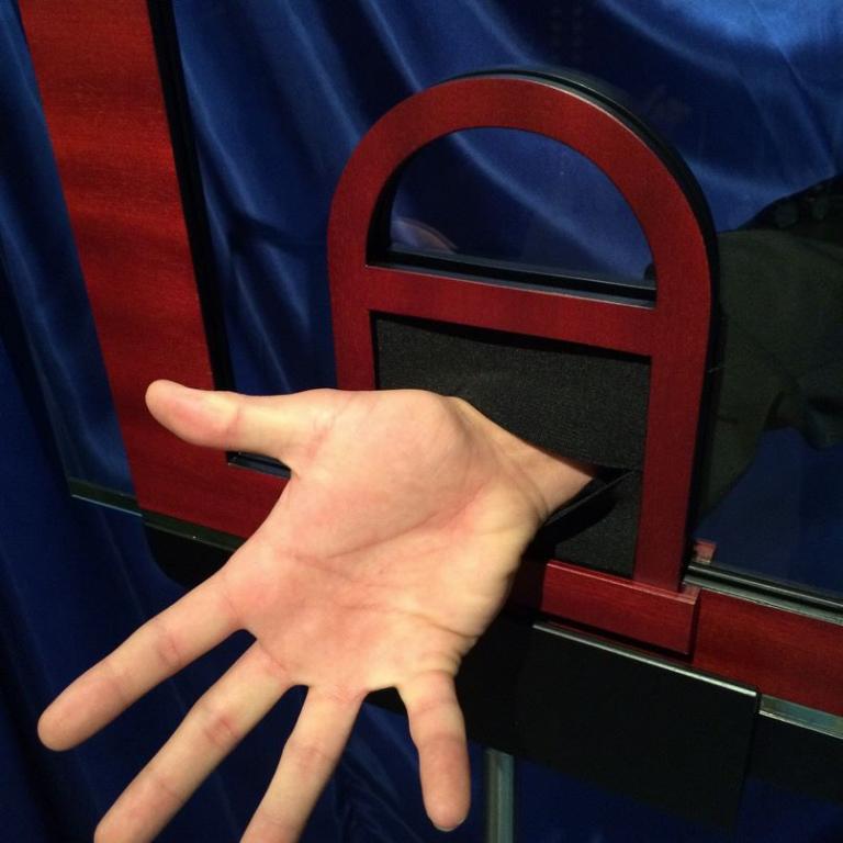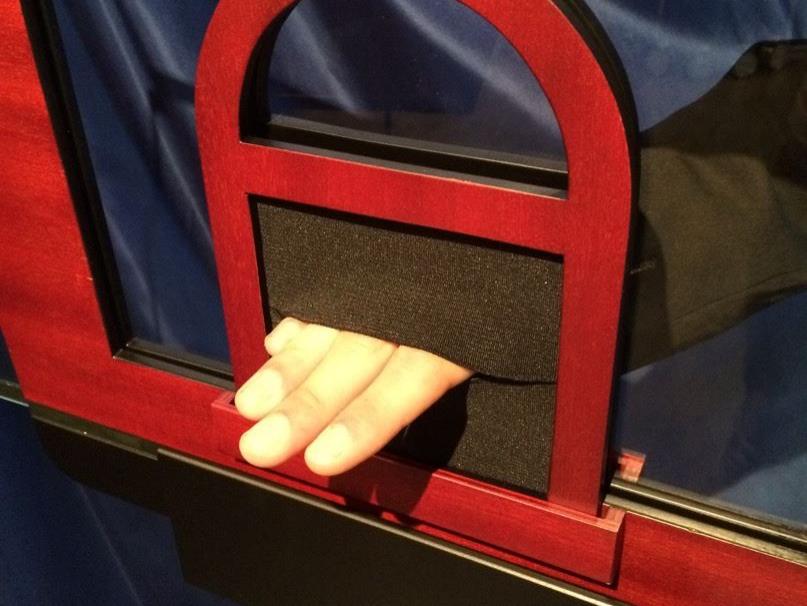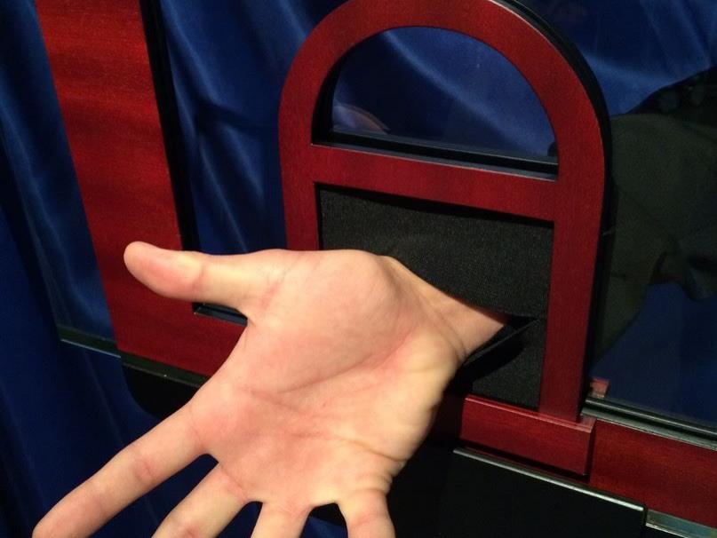 Nun zeigen Sie die rechte Hand vor, ziehen vielleicht den Hemdärmel noch ein wenig zurück - und führen die Hand von hinten nach vorne im Bereich der Abdeckplatten durch die Scheibe als wäre diese nicht vorhanden. Die Zuschauer können es nicht fassen, wenn plötzlich Ihre Fingerspitzen und schliesslich die ganze Hand vorne aus der Scheibe herauskommt. Es sieht wirklich irre aus! Sie lassen den Zuschauern jedoch keine Verschnaufpause, sondern nehmen mit der freien Hand den Rahmen aus dem Stativ und drehen sich auf der Bühne so um sich selbst, das die Zuschauer - gerne aus nächster Nähe - den Zustand von vorne, den beiden Seiten und auch von hinten betrachten können.