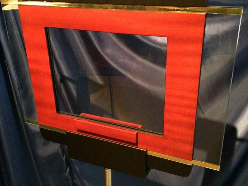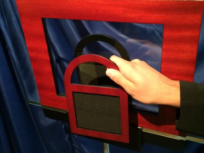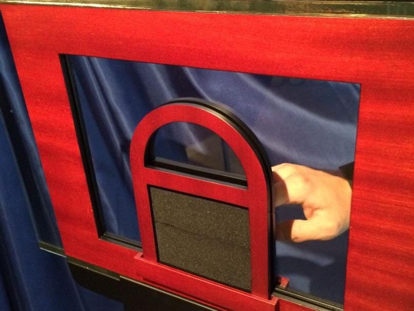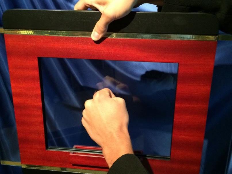 Auf einem Stativ steht eine mit Holzrahmen eingefasste, äusserst massive Glasscheibe. Seitlich steht die Scheibe aus dem Rahmen heraus, oben und unten weist der Rahmen schwarze Griffflächen auf. An diesen erfassen Sie den Rahmen und nehmen ihn vom Stativ. Sie können den Rahmen mit der Scheibe drehen und wenden wie Sie möchten, vor allen Dingen sollten die Zuschauer von beiden Seiten kräftig gegen das Glas klopfen: Keine Angst, das hält die Scheibe problemlos aus. Sie stellen die so geprüfte Scheibe zurück auf das Stativ.