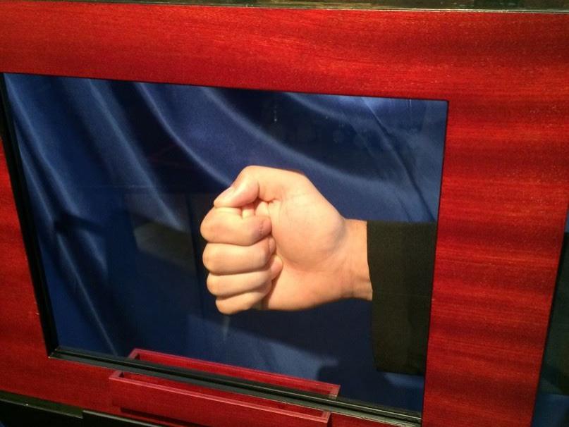 Schliesslich stellen Sie den Rahmen wieder auf das Stativ und ziehen Ihre Hand wieder aus der Scheibe. Ohne jede Verzögerung entfernen Sie die Abdeckscheiben. Ebenso können Sie Rahmen und Scheibe wieder wie zu Beginn "beklopfen" lassen. Die Scheibe ist unverletzt und nach wie vor massiv und stark. Vorführung: Kinderleicht! Kein Mindestabstand erforderlich. Lichtverhältnisse egal. Unter jeden Bedingungen zu zeigen.