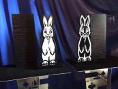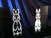 Zwei 28 cm grosse Hasen werden vorgezeigt und mit je einer leeren Hülle bedeckt. Danach werden die Hüllen wieder abgenommen und sogleich haben die Hasen die Plätze vertauscht! Dieses Spiel wird so lange wiederholt, bis das Publikum merkt, dass Sie die Hüllen immer umdrehen. Die Sache scheint klar zu sein. Ein Hase ist auf der Vorderseite weiss und auf der Rückseite schwarz. Ihr Publikum will sich nicht länger auf den Arm nehmen lassen und verlangt schliesslich, dass Sie die Hasen umdrehen.