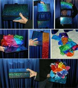 Wir sind es unserem Ruf schuldig, wieder einmal ein extravagantes Produktionsrequisit anzubieten. Mit MAGIC CASKET stellen wir Ihnen die handbequeme Funktion, das Salonwirksame Prachtstück und das grosse Mysterium gleichzeitig vor. Ob Sie Blumen, Tücher, ja zwei Tauben, Streamer, Gläser, Bälle oder auch andere Dinge erscheinen lassen wollen, MAGIC CASKET macht s Ihnen möglich. Völlig unproblematisch bei sinnvollem Präsentationsablauf. Sie öffnen Deckel, Sie öffnen Boden, Sie schauen durchs Leere direkt Ihre Zuschauer an - die auch dicht dran sitzen können! Sie schliessen Boden und Deckel und MAGIC CASKET ist augenblicklich produktionsbereit. Gewissermassen flott serviert. Denn das ist eben auch das Schöne an MAGIC CASKET; vom ersten In - die - Hand - nehmen bis zum Hervorzaubern ist ein Fluss in der Handhabung, weil diese Schatulle in der Tat zweckmässig konstruiert ist. Es läuft wirklich alles wie von selbst. MAGIC CASKET ist sehr sorgfältig und stabil verarbeitet. Das Material ist eine Holz - Metallkombination mit funkelndem Glimmer allflächig belegt. Die Masse; 250 x 160 x 80 mm. Wer mit MAGIC CASKET arbeitet, lernt die Kunst des Hervorzauberns aus dem Nichts von einer der schönsten Seite des Applauserfolges kennen.