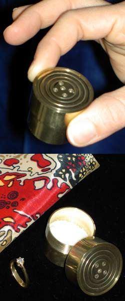 Ein Trauring wird unter ein Tuch gegeben. Ein Zuschauer hält das Tuch und fühlt deutlich den Ring. Plötzlich ziehen Sie das Tuch aus seiner Hand, schlagen es aus - und der Ring ist spurlos verschwunden! Ideales Hilfsmittel zum "zeitlich versetzten Verschwindenlassen" eines Ringes, der sich schon längst an anderer Stelle befindet, z.B. im MAGISCHER SALZSTREUER o.ä..