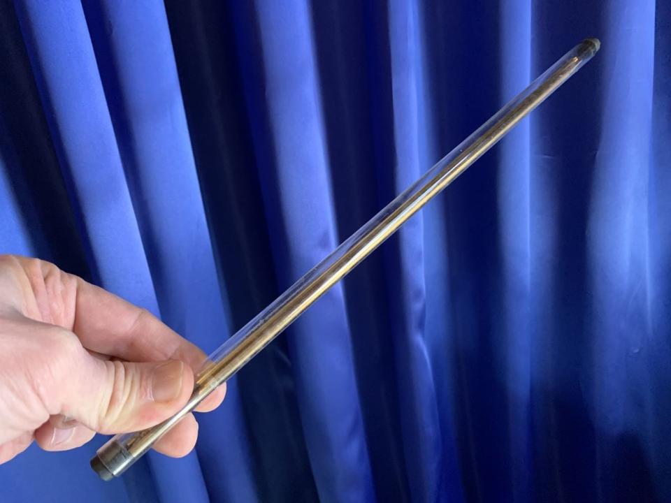 Die ca. 60 cm (!) lange Nadel aus Messing lässt sich nämlich in der Mitte auseinanderschrauben. In einem kleinen Kunststoffröhrchen verpackt, misst das Ganze dann nur noch 35 cm und passt somit in jeden normalen Zauberkoffer.