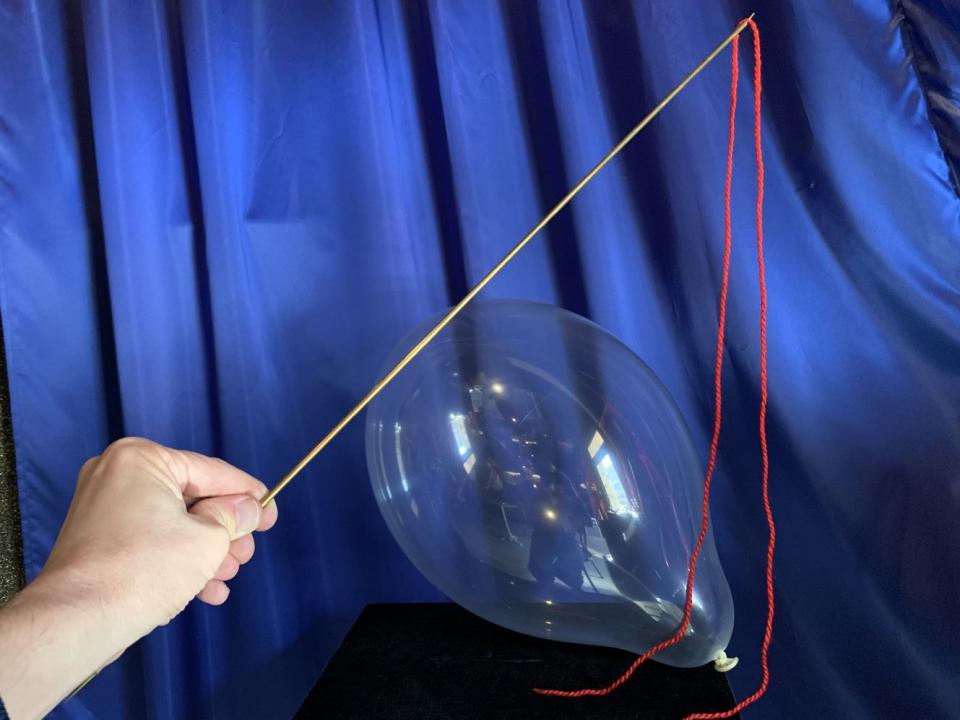 Ein grosser, transparenter Luftballon wird vor den Augen Ihrer Zuschauer mit einer langen Nadel, an der sich ein roter Wollfaden befindet, durchstochen.