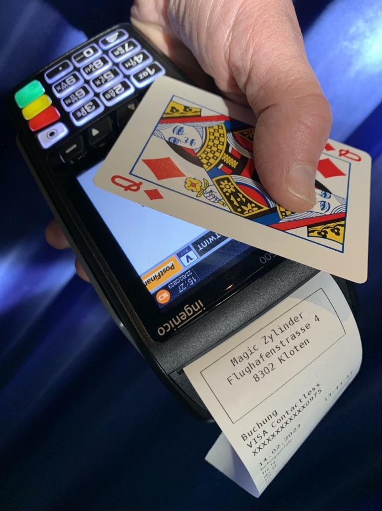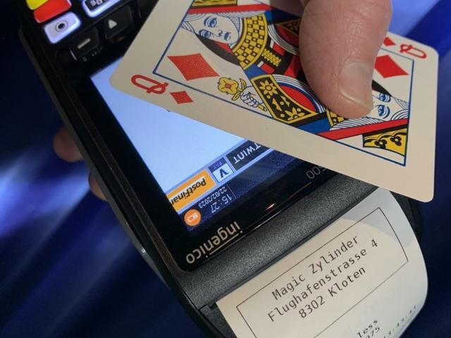 Mit dieser Karte sorgen Sie für Verwunderung an der Kasse. Statt Ihrer EC-Karte legen Sie eine Karte aus Ihrem Kartenspiel auf das EC-Lesegerät! Die Bezahlung wird erfolgreich abgeschlossen, Sie gehen und hinterlassen verdutzte Gesichter! Für die Wirkung auf die umstehenden Personen haben Sie hier einen Effekt zur Hand, bei dem jeder grosse Augen machen wird! An der Supermarktkasse, im Restaurant oder im Bekleidungsgeschäft, stets lautet die Frage "Zahlen Sie bar oder mit Karte?" Daraufhin nehmen Sie eine der Karten aus Ihrem Kartenspiel und halten sie an das EC-Lesegerät. Das Gerät piept, der Datenaustausch läuft und die Bezahlung wird erfolgreich abgeschlossen! Der Kassierer schaut Sie mit grossen Augen an, während der Beleg ausgedruckt wird.