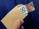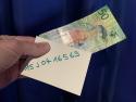 Sie entleihen sich von einem Zuschauer einen x-beliebigen Geldschein (10er, 20er, 50er oder 100er). Für sein Geld erhält der Zuschauer eine Quittung. Sie stellen diese für alle gut sichtbar aus, geben sie in einen kleinen Umschlag und befestigen diesen an der Ziertuchtasche des Zuschauers. Die Nummer des entliehenen Geldscheins wird nun der Ordnung halber notiert, und zur zusätzlichen Kontrolle reissen Sie noch eine kleine Ecke des Geldscheins ab (sozusagen als Zins für den entliehenen Betrag).