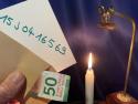 Nach dieser 'Amtshandlung' kommt der Schein in ein Briefkuvert, eine Kerze wird entzündet und das Kuvert damit durchleuchtet. Der Schein ist für alle zu sehen. Während Sie nun dem Publikum erzählen, es sei soeben Zeuge des modernen 'Home-Bankings' geworden, wandert die brennende Kerze im Hintergrund langsam auf das Kuvert mit dem Geldschein zu und setzt es in Brand. Grosses Malheur!