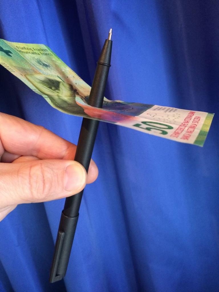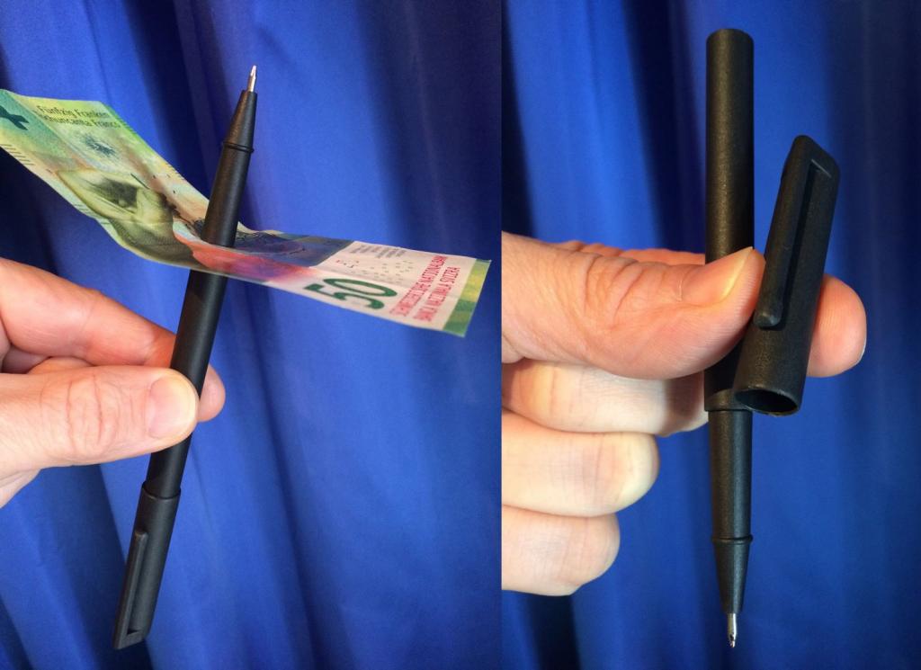 Das ist eine NEUE Ausführung dieses beliebten Effekts! Sie erhalten von uns einen ganz harmlos aussehenden Schreiber, mit dem Sie eine ganze Serie von Effekten ausführen können. So können Sie zum Beispiel beliebige Gegenstände (Karten, Tücher usw.) DURCHDRINGEN! Der beliebteste Effekt ist jedoch das Durchdringen eines geborgten Geldscheins, den Sie sofort OHNE Austausch untersuchen lassen können! Das Beste: Auch der Schreiber lässt sich ohne Weiteres untersuchen! Perfekte Close-up Magie, wie es die Zuschauer lieben. Sie werden den WONDER-PEN immer bei sich tragen!