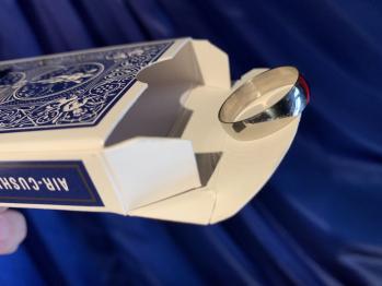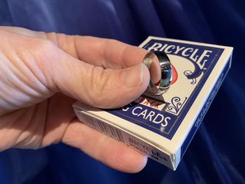 Sie legen einen (ausgeliehenen) Ring auf eine Bicycle-Kartenschachtel, die vorgängig leer gezeigt und dann geschlossen wurde. Sie decken den Ring mit einer einzelnen Karte ab, tippen daran und der Ring verschwindet in die Schachtel, aus der Sie ihn dann entnehmen. Denselben Effekt können Sie auch mit einer von einem Zuschauer markierten Münze präsentieren. Sie erhalten alles komplett mit einer ausführlichen Gebrauchsanleitung. Sehr effektvoll und einfach in der Vorführung. Sehr empfehlenswert!