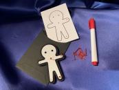 Sie zeigen ein kleines weisses Schaumstoffmännchen (7 cm hoch) mit je einem Einstichloch an den Händen, Füssen und in der Brust. Dann übergeben Sie einem Zuschauer fünf kleine Kunststoffpieker und präsentieren einen schwarzen Umschlag als Vorhersage. Der Zuschauer soll seiner Intuition und seinen Gefühlen freien Lauf lassen und nach eigenem Belieben ein, zwei, drei, vier oder alle 5 Pieker in die Einstichlöcher am Männchen stecken. Dabei kann er seine Entscheidung sooft ändern, wie er möchte. Sobald er sich festgelegt hat, ziehen Sie Ihre Vorhersage aus dem Umschlag. Es kommt die Zeichnung eines kleines Voodoomännchens zum Vorschein, die entsprechend der Wahl des Zuschauers zuvor an den genau gleichen Stellen markiert wurde. Ein sehr cleveres Trick System, ein Trick zum immer dabei haben.