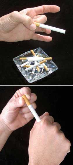 Eine sehr verblüffende Trickfolge erhalten Sie mit DE LA CIGARETTE! Mit diesem für die Zuschauer unsichtbaren Requisit können Sie ohne jede Fingerfertigkeit und Übung beliebig viele Zigaretten einfach aus der Luft greifen. Sie können die Zigaretten in einen Hut werfen und zum Schluss an die Zuschauer verteilen. Sie nehmen eine Zigarette aus dem Hut und zünden sie sich an. Diese brennende Zigarette stecken Sie in Ihre Faust. Die Hand wird geöffnet: Die Zigarette ist spurlos verschwunden! Anschliessend können Sie die Zigarette (immer noch brennend) aus der Hosentasche wieder zum Vorschein bringen. Oder: Ein (markierter) Geldschein verschwindet in freier Hand und erscheint in Ihrer Brieftasche. Geht mit Zigarette, Zigarre oder Bleistift, und das ohne Fingerfertigkeit, wann und wo immer Sie wollen. Sie erhalten ZWEI Kunststücke komplett mit zwei Hilfsmitteln, jedoch ohne Zigaretten; die haben Sie bestimmt selber.