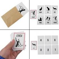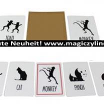 Der Vorführende überreicht einem Zuschauer einen Umschlag mit einer Vorhersage darin. Danach präsentiert der Zauberer sechs Poker Karten mit bedruckten Tieren wie: Hase, Frosch, Katze, Wolf, Panda und Affe. Um ein Tier Auszuwählen wählt der Zuschauer eine Zahl von 1 - 6, sagen wir z.B. 3 das ist der Affe. Das Kuvert wird vom Zuschauer geöffnet und es ertönt ein Geräusch, ein Rascheln! Der Zuschauer erschreckt, und lässt das Couvert fallen, darin ist ein zweites Couvert und darin ist EINE Karte, bedruckt mit einem Affen! War das Rascheln von einem Affen. Super in der Wirkung aber einfach zu erlernenen, komplett mit sehr schön gedruckten Karten und deutscher Beschreibung.
