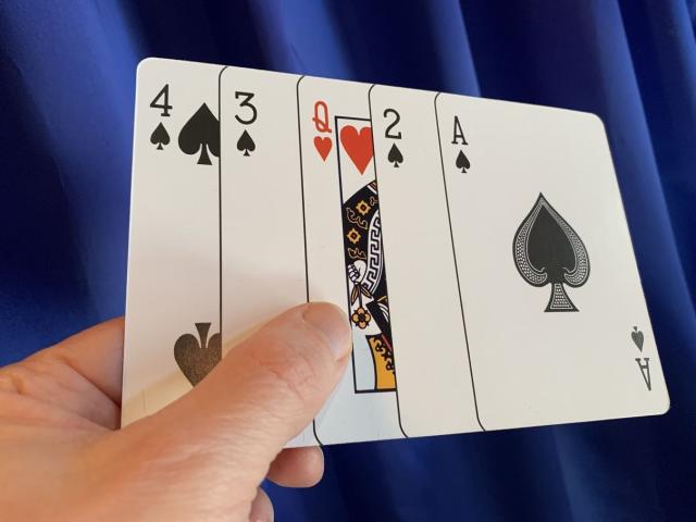 Ein Zuschauer soll versuchen, die mittlere von fünf Karten die: HERZ DAME mit einer Wäsche Klammer zu markieren. Dies wird ihm aber unmöglich gelingen.