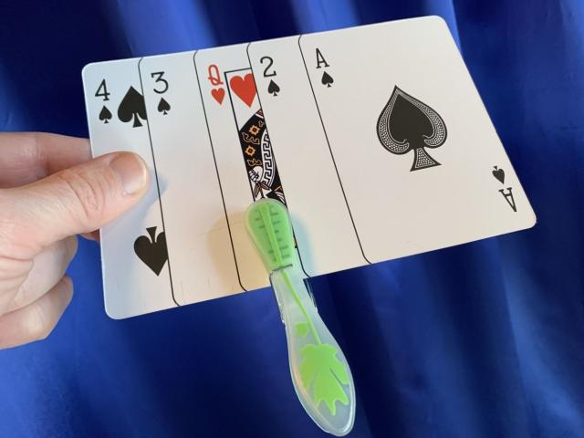 Sie drehen die Karten mit der Rückseite nach oben, und der Zuschauer steckt die Klammer auf die mittlere Karte. Werden die Karten nun umgedreht, steckt die Klammer aber auf einer ganz anderen Karte, nur nicht auf der mittleren! Ein irrer Spass, nicht nur für Ihre nächste Party.