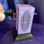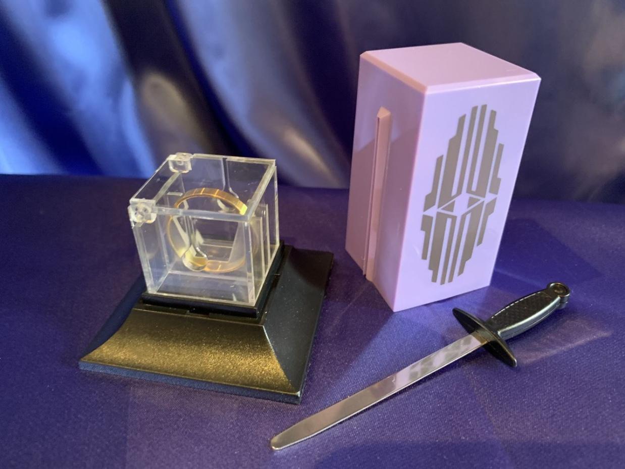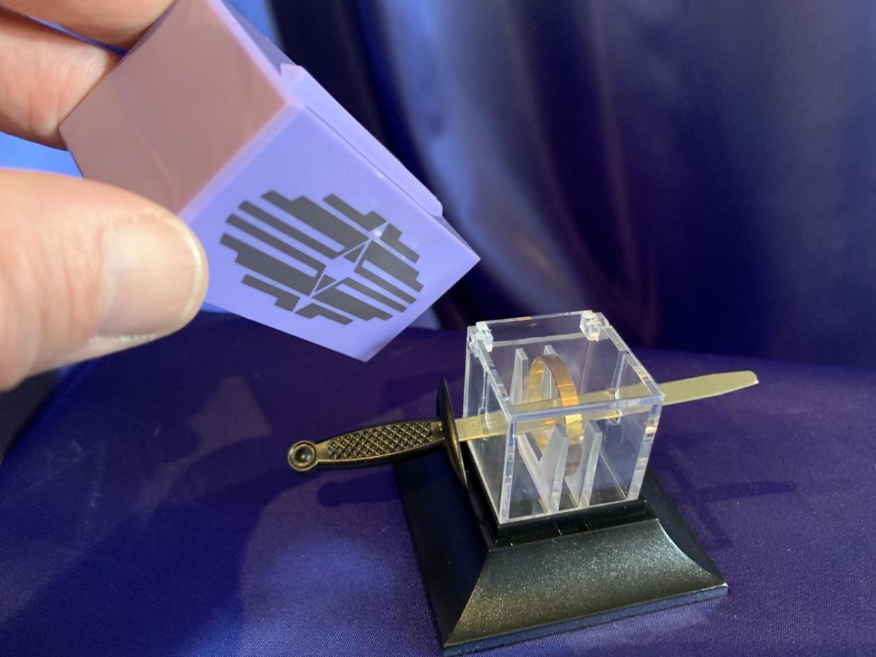 Sie zeigen den Zuschauern eine völlig unpräparierte Plexiglasbox mit einem Deckel. Dann leihen Sie sich einen Fingerring aus und geben ihn in die Plexibox. Sie schliessen sie mit dem Deckel und stellen sie auf ein kleines Podest. Nun zeigen Sie eine Vierkantröhre, die an den Seiten geschlitzt ist, und bedecken damit die Plexibox. Es kommt nun ein Miniaturschwert zum Vorschein und wird oben in die Seitenschlitze gesteckt. Heft und Schwertspitze bleiben zu jeder Zeit sichtbar! Und dann geschieht ein kleines Wunder: