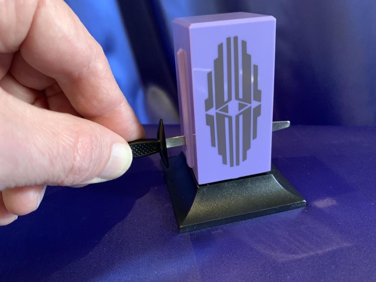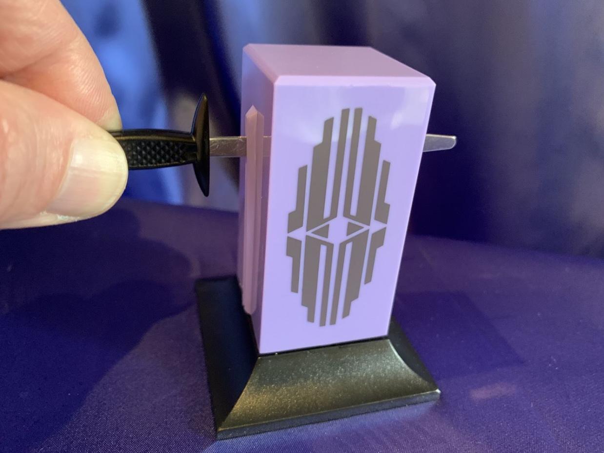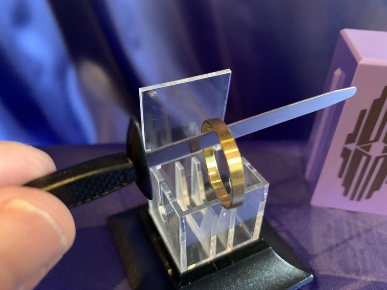 Langsam führen Sie das Schwert nach unten und plötzlich – mit einem kleinen Klick – durchdringt es sowohl die Plexibox als auch den geliehenen Fingerring des Zuschauers. Dieser nimmt sofort die Röhre ab und kann jetzt seinen Ring, der an dem Schwert hängt, der Plexibox entnehmen.