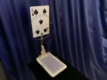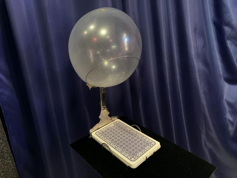 Sie zeigen einen unpräparierten Ballon und blasen ihn auf. Er wird dann zwischen zwei Drahtringe gelegt, die auf einem Stativ befestigt sind. Nun wird ein Zuschauer gebeten, eine Riesenkarte aus einem Riesenkartenspiel zu wählen, sie zu signieren und dann ins Spiel zurückzugeben. Das Spiel kommt auf ein silbernes Metalltablar, das sich am Fusse des Stativs befindet. Plötzlich platzt der Ballon und die SIGNIERTE Riesenkarte des Zuschauers erscheint darin und kann sofort untersucht werden. Ein sensationeller Effekt, jetzt NEU MIT RIESENKARTEN! Sie erhalten beste Feinmechanik, absolut funktionssicher und ganz einfach zu bedienen. Eigentlich zaubert das Requisit für Sie. Sie brauchen sich nur auf die Show zu konzentrieren. Für Salon und Bühne geeignet. Wollen Sie gleichzeitig ein SAMMLERSTÜCK und ein sehr EFFEKTVOLLES Kartenkunststück erwerben, so entscheiden Sie sich für dieses Präzisionsrequisit! Wir liefern Ihnen den RIESENKARTENBALLON mit Riesenkarten und deutscher Gebrauchsanleitung.