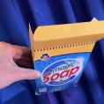 Um die Tücher zu „waschen“, steckt der Magier sie in eine Schachtel mit angeblichem Waschmittel. Als Waschpulver gibt er ein paar Spritzer aus unserem QUITSCHENDEN SALZSTREUER in die Box, und als Weichspüler giesst er etwas Milch aus dem ZAUBER–MILCHGLAS dazu. Er erklärt, der Karton funktioniere wie eine magische Waschmaschine.