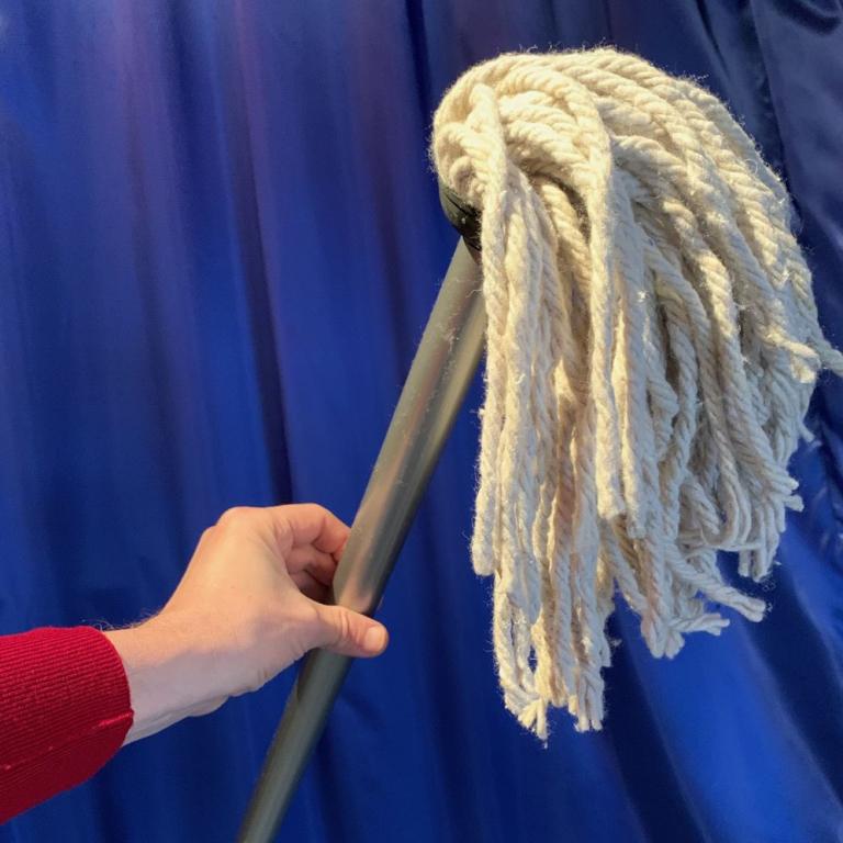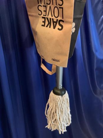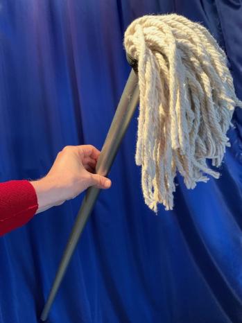 Toller Gag für Ansager, Conférencier und Zauberkünstler! Der Vorführende kommt mit einer Papiertragetasche auf die Bühne. Nach einigen witzigen Bemerkungen (z. B. dass der Boden auch schon mal sauberer war et.) dreht er die Tasche um und heraus kommt ein richtiger Mopp, Gesamtlänge 1,50 m mit dem erst einmal der Boden feucht aufgenommen wird. Der Mopp sieht absolut echt aus und es können Kehrbewegungen damit gemacht werden!