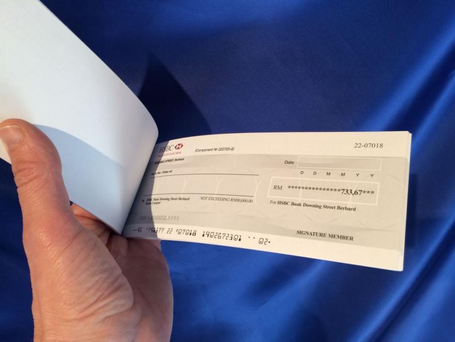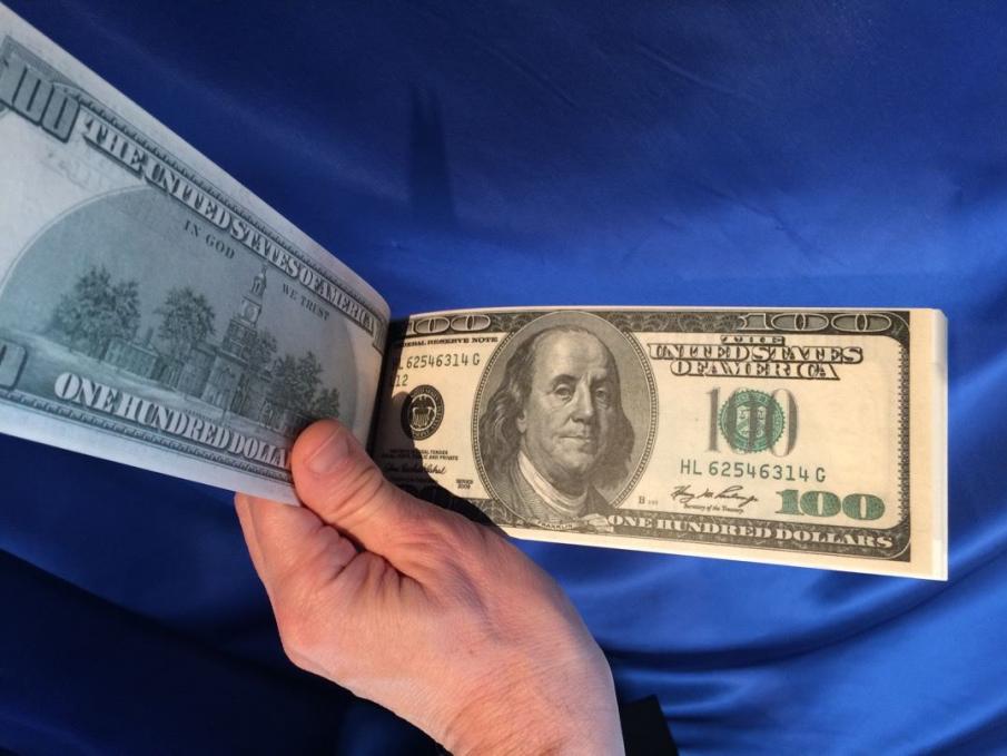 Sie zeigen ein Scheckbuch der HSBC Bank, das absolut echt aussieht, und blättern es durch. Es befinden sich aber nur leere Scheckformulare drin, daran gibt es keinen Zweifel. Nach Pusten oder einem Zauber-spruch verwandelt sich der Block allerdings in lauter Geldscheine, und das sogar in verschiedenen Währungen. Da sind englische Pfund zu sehen, aber auch Euros und sogar einige 100 Dollar-Noten. Die Schecks haben sich also in Geld verwandelt, und zwar beidseitig.