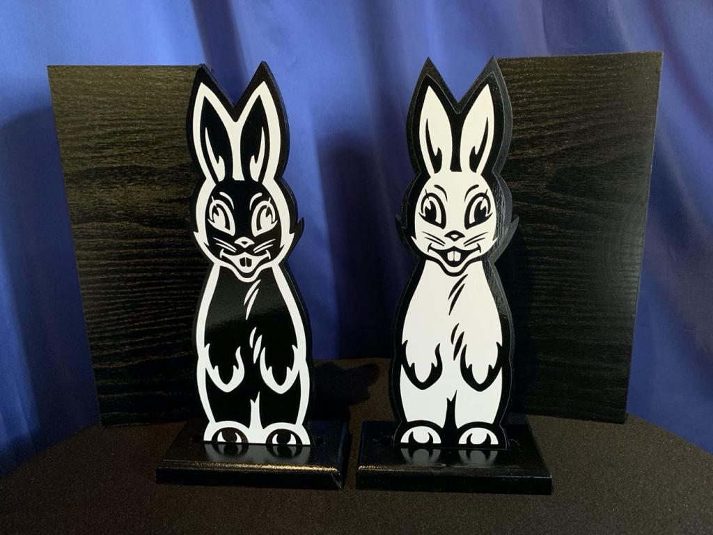 Zwei 28 cm grosse Hasen werden vorgezeigt und mit je einer leeren Hülle bedeckt. Danach werden die Hüllen wieder abgenommen und sogleich haben die Hasen die Plätze vertauscht! Dieses Spiel wird so lange wiederholt, bis das Publikum merkt, dass Sie die Hüllen immer umdrehen. Die Sache scheint klar zu sein: Ein Hase ist auf der Vorderseite weiss und auf der Rückseite schwarz. Ihr Publikum will sich nicht länger auf den Arm nehmen lassen und verlangt schliesslich, dass Sie die Hasen umdrehen.