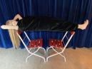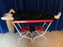 Hier wurde ein superprofessioneller Effekt geschaffen. Ausgehend von der bekannten Stuhlschwebe ist diese Illusion auf kleinstem Raum umringt vorführbar. Sie brauchen nicht einmal eine eigene Assistentin, sondern können fast jede Dame aus dem Publikum nehmen. Nun kommt aber erst der Clou: Obwohl die Dame unpräpariert und uneingeweiht ist, sind Sie in der Lage, das Brett wegzunehmen, auf dem sie liegt. Hier unter-scheidet sich die Illusion von der normalen Stuhlschwebe. Die Dame schwebt wie auf dem Bild ersichtlich völlig frei und ist lediglich mit einem Tuch bedeckt. Sie bauen die Illusion vor dem Publikum auf und anschliessend wieder ab. Die Dame selbst bekommt nichts mit. Ein absolutes Rätsel für jeden Zuschauer! Sie können sich während der Darbietung völlig frei bewegen! Die Entfernung der Zuschauer spielt auch keine Rolle.