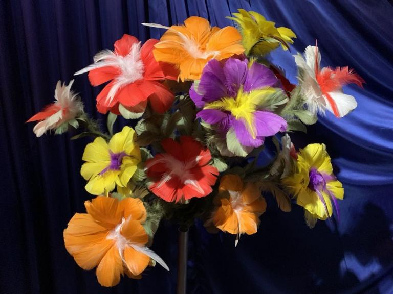 Voluminöses Riesen-Federblumenbouquet mit 25 bunten Blüten. Produzieren Sie es aus einem Umhang, Mantel oder auf andere Art und Weise. Klein zusammenlegbar. Der gesamte Strauss hat eine Höhe von ca. 80 cm und einen Durchmesser von ca. 70 cm. Jede einzelne Blüte hat einen Durchmesser von ca. 15 cm.