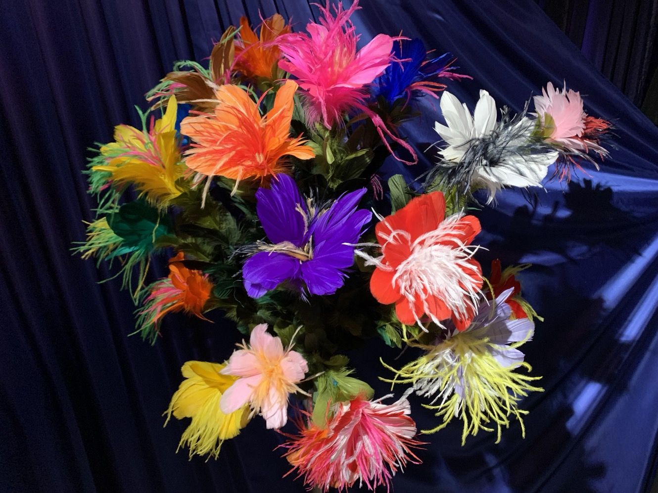 Voluminöses Riesen-Federblumenbouquet mit 24 bunten Blüten. Produzieren Sie es aus einem Umhang, Mantel oder auf andere Art und Weise. Klein zusammenlegbar. Der gesamte Strauss hat eine Höhe von ca. 80 cm und einen Durchmesser von ca. 70 cm. Jede einzelne Blüte hat einen Durchmesser von ca. 15 cm.