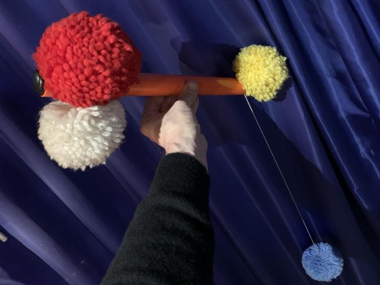 Der Zauberer zeigt einen grossen orangefarbenen Stab, an dem grosse, verschiedenfarbige Pompons mit Schnüren befestigt sind. Er zieht die blau-gelben Pompons nach oben oder unten, um zu zeigen, wie sie an einer Schnur verbunden sind und wie diese frei durch die Löcher des Stabs gleitet.