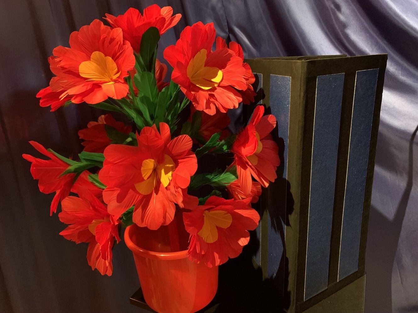 Der Illusionist zeigt ein Paneel auf beiden Seiten. Er legt es auf den Boden, und einen Augenblick später lässt er dahinter ein riesiges Blumenbukett in einem Blumentopf erscheinen.