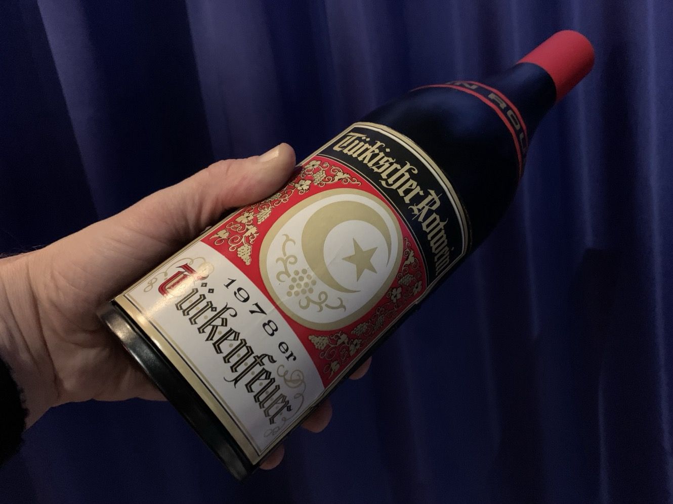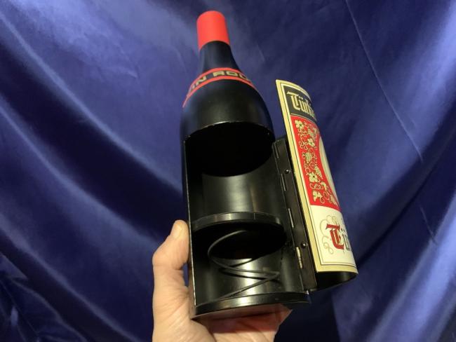 Die Flasche ist aus Aluminium, schwarz einbrennlackiert und mit einem grossen deutschen Weinetikett beklebt. Im oberen Abteil bringen Sie genügend Flüssigkeit unter, um mindestens zwei normale Weingläser füllen zu können. Das untere Abteil nimmt ein komplettes Weinglas auf, das durch eine starke Feder nach oben an eine Gummidichtung gedrückt wird. So kann nichts auslaufen, und Sie können – obwohl Sie die Flasche auf den Kopf stellen und auch noch schütteln – das gefüllte Weinglas produzieren.