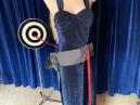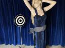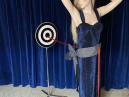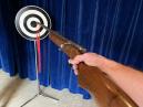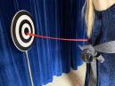 Ein an einer Kugel befestigtes Band wird in ein Gewehr geladen. Wenn auf der anderen Seite der Bühne auf das Ziel, vor dem Ihre Assistentin steht, geschossen wird, durchbohrt das Band den Mittelteil der Assistentin und die Kugel steckt auf der Zielscheibe. Es ist zu sehen, wie das Band durch den Körper der Dame läuft und ohne negative Auswirkungen hin und her gezogen werden kann.